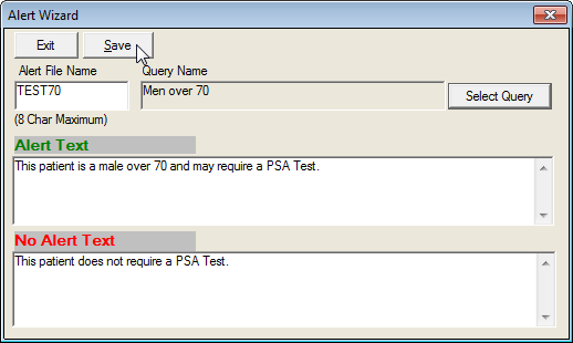 SQL Alert Query: The alert property is used to generate a message based on the results of the SQL query. For example, Patient Needs Mammogram.” The ‘No Alert’ Text field is used to enter a specific message that is displayed when the query generates no results. The ‘Alert’ Text field is used to enter a specific message to be displayed when query results are generated.