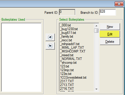 Boilerplates: This section of the screen allows “new” boilerplates to be created and existing boilerplates to be edited or deleted. Boilerplates may also be activated by selecting an item from the Select Boilerplates list and clicking on the left arrow key, which moves it to the Boilerplates Used field. To remove an item in the Used Boilerplate field, select the item and click on the right arrow key to return it to the Select Boilerplates list.