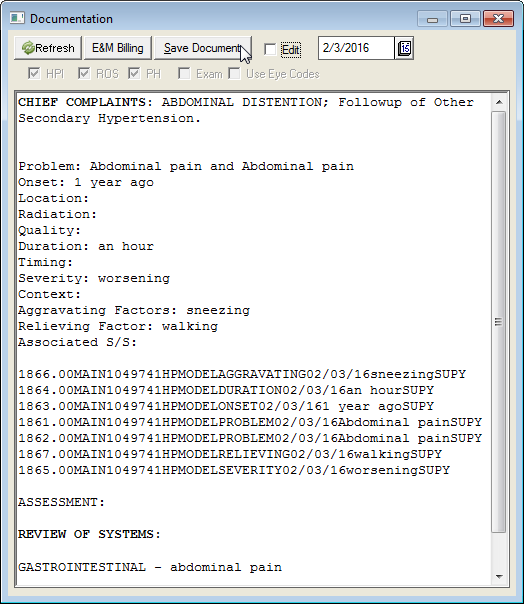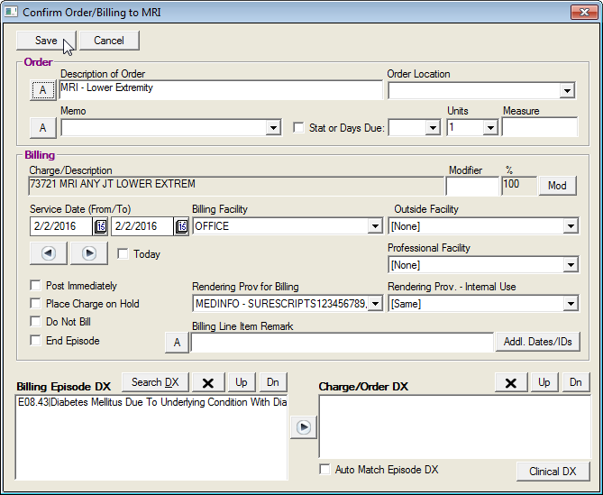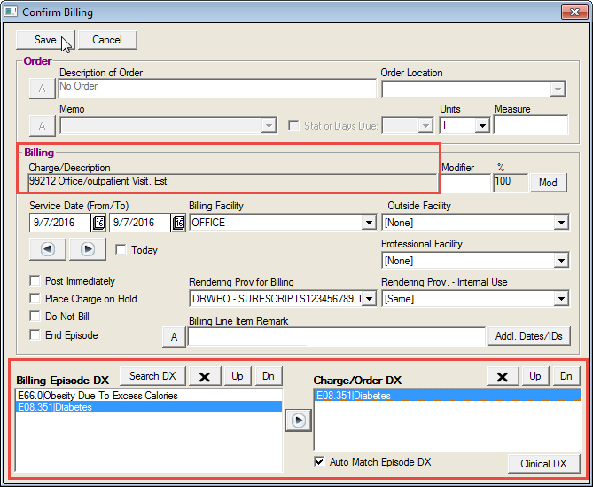 RenderingDoctor for Billing will default to the current user’s Rendering Doctor code (a Security setup) or to the last one selected.