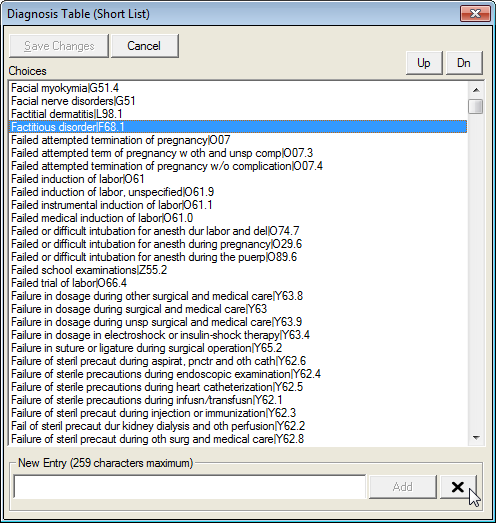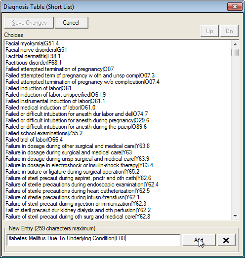 Enter a diagnosis description and ICD9 code in the New Entry field in the format: Description|Code.