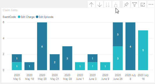 - Claim Edits (Stacked Column Chart) – View claim edits by event date, color-coded for charge and episode edits. Drill up/down for annual, monthly and expand (fork) to view by linear, date timeline. Right-click and Drill through to Details to view specifics, such as patient account, date, user, stationed, and event description (charge Id).