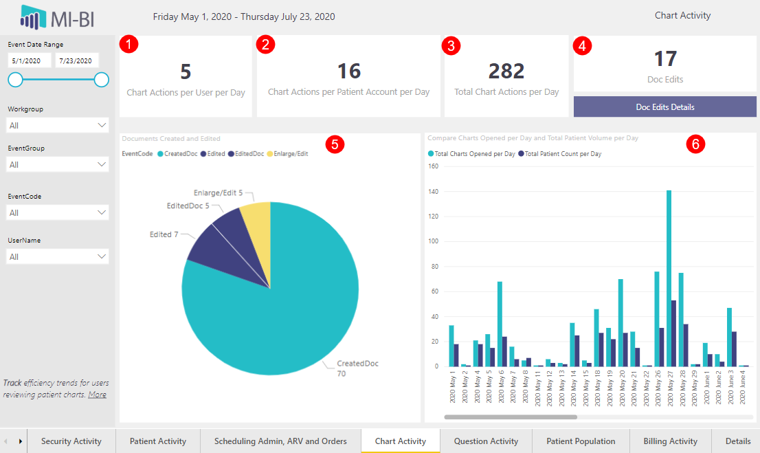 - Chart Actions per Patient per Day – What is the average effort to work up each patient? Chart actions logged per patient account from opening to closing the chart per day, within the selected date range. Events are logged with the Event Group “CHART” and Event Code “Action”.