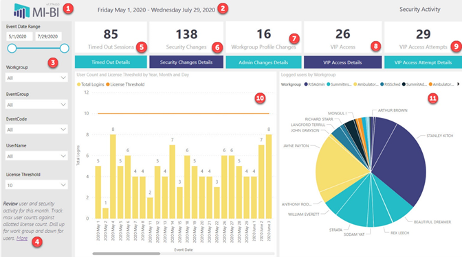 Security Activity – User security and workgroup profile changes, VIP patient access, and total user logins to track against licensed user count.