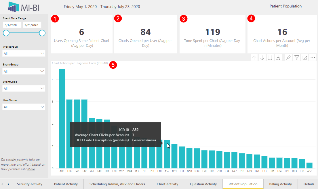 - Tooltip – Hover to view the code description, and average chart clicks per account (total chart actions per account with ICD code divided by number of counts with same ICD code)