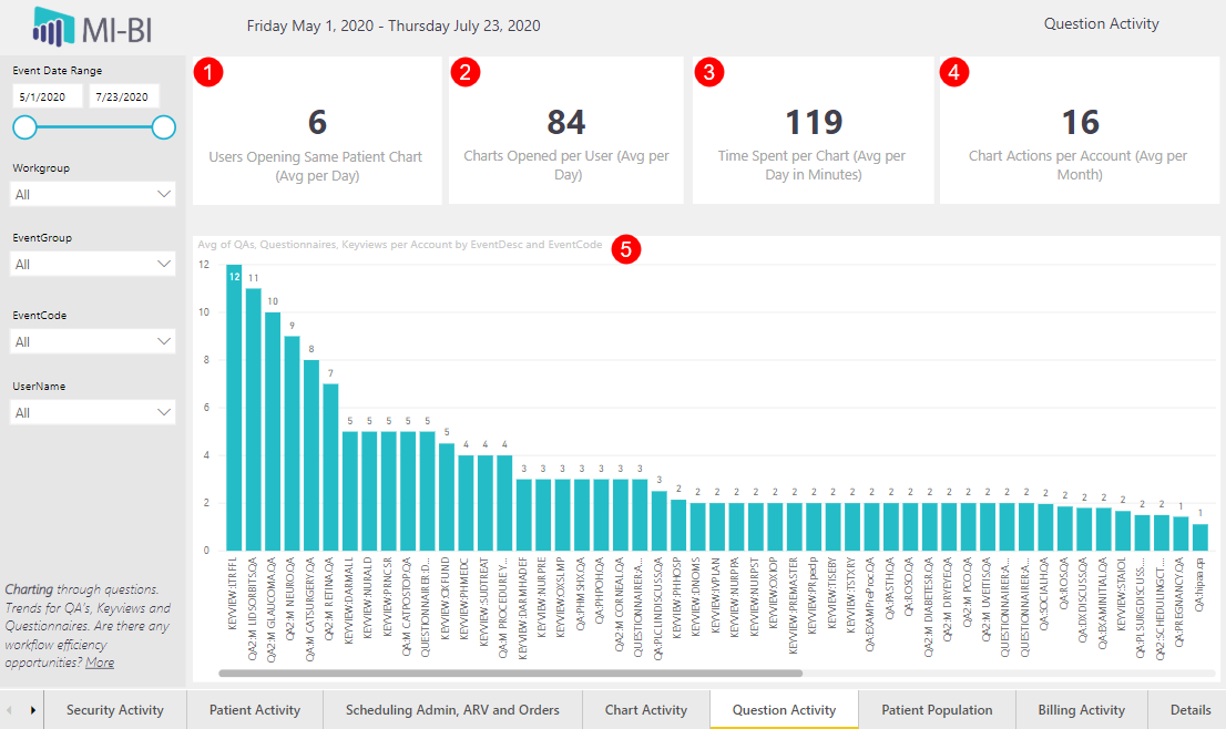 Question Activity - User activity related to opening and working in patient charts, time spent, and trends in questionnaire use (Keyviews and QAs).