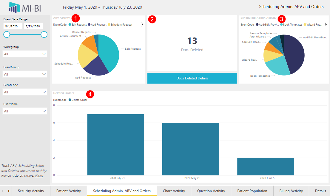 - ARV Activity (Pie Chart) – Events logged with the Event Group “APPTREQ” and categorized by Event Code, including “Add Request”, “Edit Request” and “Cancel Request”. Right-click and Drill through to Details to view specifics, such as patient account, date, user and stationid.