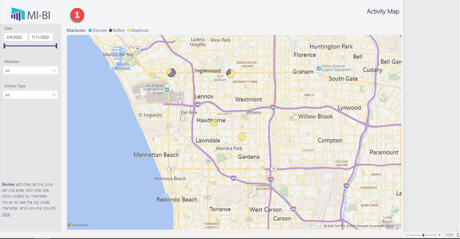 Activities by Marketer (donut): Proportional representation of each marketer based on the total number of activities they created within the selected date range. Right-click to drill through to view activity details.