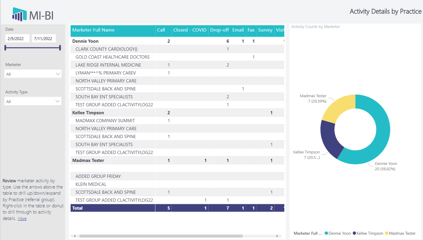 Activity Details by Practice: Each marketer is listed with a count of each activity type in a grid. Use the arrows above the grid to drill down to activity counts by Referral Group. Or use the expand arrow to view each practice by marketer. Sort by any column by clicking the column header. Right-click to drill through to view activity details. Note that if the activity is associated with a referral source who is not assigned to a referral group, then the Referral Group Name is blank.