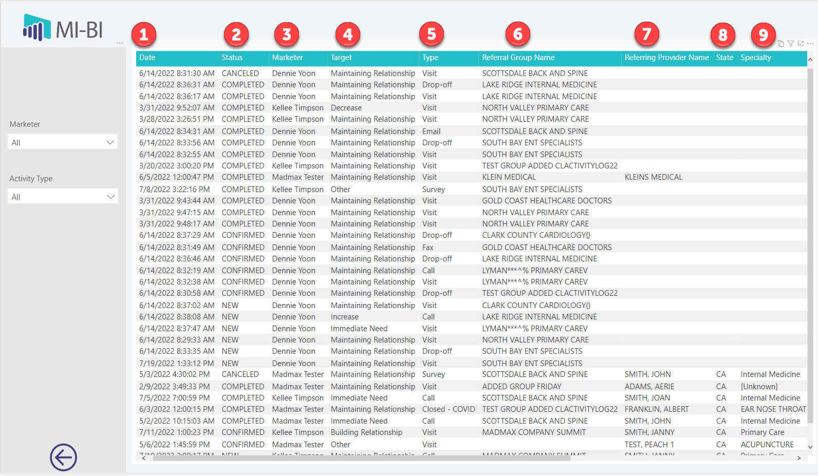 Activity Details by Specialty: Each marketer is listed with a count of each activity type in a grid. Use the arrows above the grid to drill down to activity counts by Referral Specialty. Or use the expand arrow to view each specialty by marketer. Sort by any column by clicking the column header. Note that activities associated ONLY with a referral group (practice) and not an individual referring clinician are excluded from this table. Right-click any row to drill through and view the activity details.