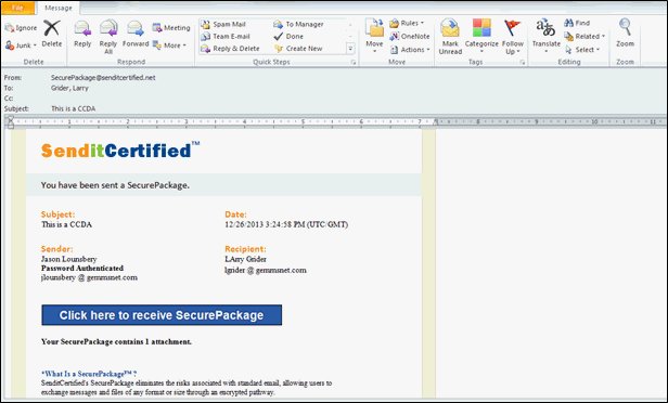 4. The recipient will receive an email that appears as the following. By clicking on the secure link they can access the message and attachments.