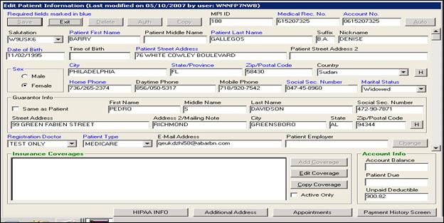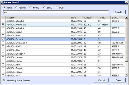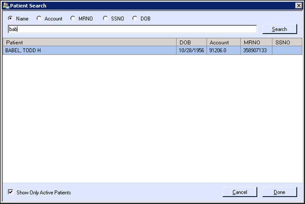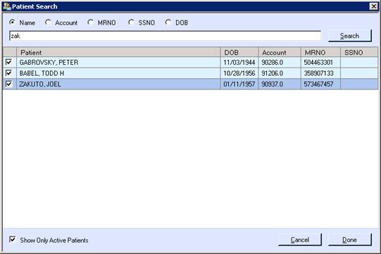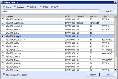 2. Patients can be searched for by name, account number, medical record number, social security number or date of birth.
