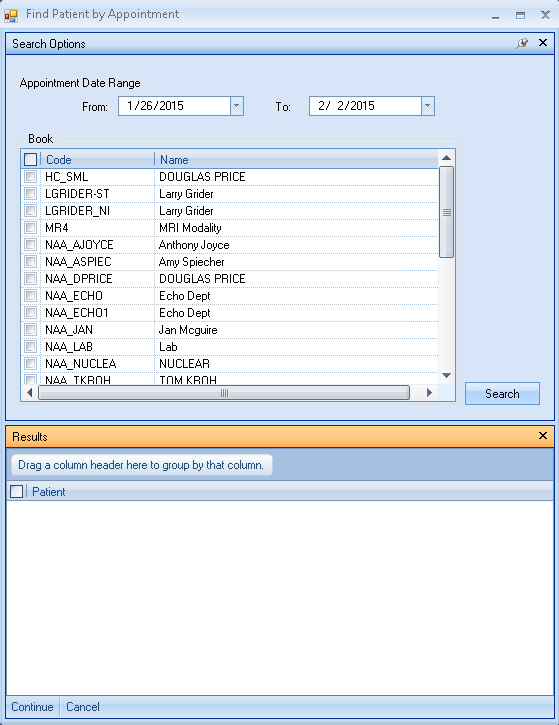 2. Select the By Appointment tab and the following screen will appear to select a date range for appointments and for further detailed search an appointment book(s) can be selected for that date range.