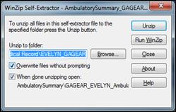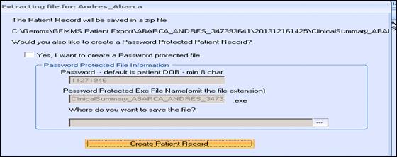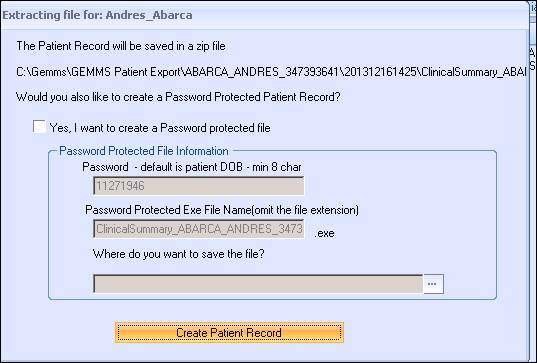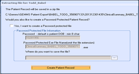 10. The last step is to click the Create patient Record. This will create a Password protected file in self extracting executable format. Within the zip file is the patient record in an xml format patient record and style sheet which renders the xml file into a human readable format. When the user selects the zip file for viewing a dialog box requests the password. The executable then unzips the files to a given location and opens the record in the browser.