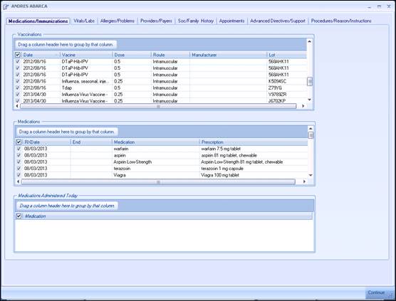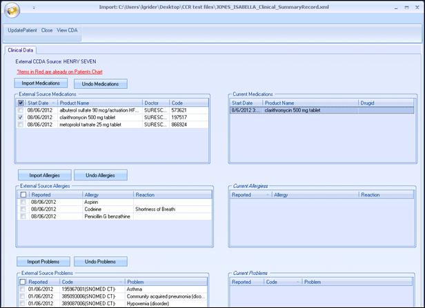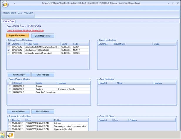 6. Once the patient is either found or created as a new patient, the clinical data available for importation into the EHR will be displayed. At this time you can now compare existing medications, allergies and problems that are currently in your EHR to those listed in the CCDA. By following the simple process outlined below selected information may be merged from the CCDA to the patients existing EHR clinical data.