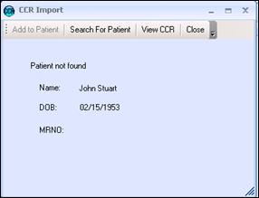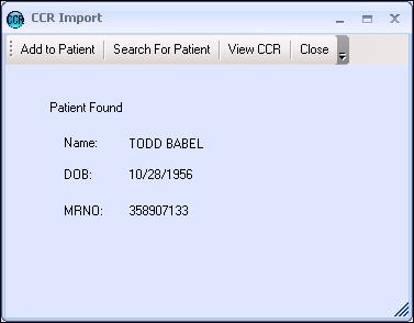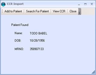 8. If a patient is found that is an exact match within the EHR, the Add to Patient button will be enabled. The CCR can be viewed prior to import by clicking the View CCR button.