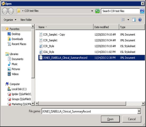 1. Click the CCDA/CCD button and browse to the location where incoming CCDA files are located. Note that these files will arrive by a secure messaging system and need to be saved to a directory that is accessible from you computer.