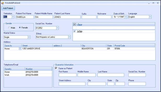 5. Any changes to the displayed demographics can be made at this time. Once you are satisfied with the information click the Add Patient button to create the new patient in the EHR and practice management system.