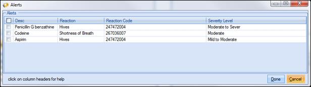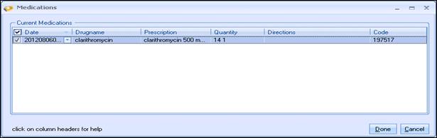 9. Once the Import Medications button is clicked the following screen will be displayed to allow you to verify the drug for import. The medication must again be selected by clicking the check box to the left of the medication. This is a safeguard to prevent the unintentional merger of a medication. Once you have again selected the medication and click the Done button.