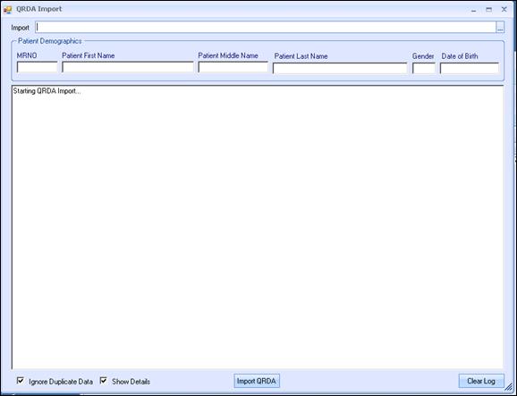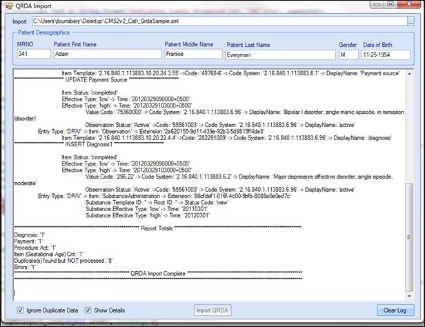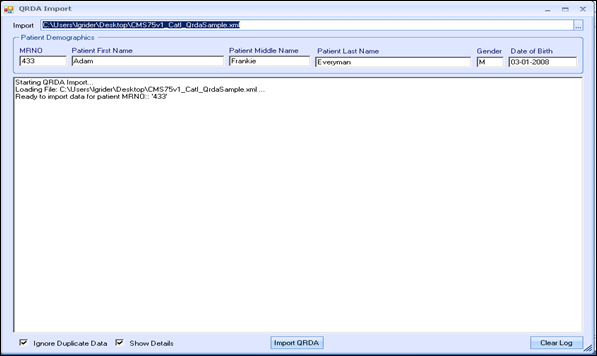 6. Once the QRDA file is imported the summary report of data that was extracted from the XML file and stored in the MU reporting table with a message that the import is completed.