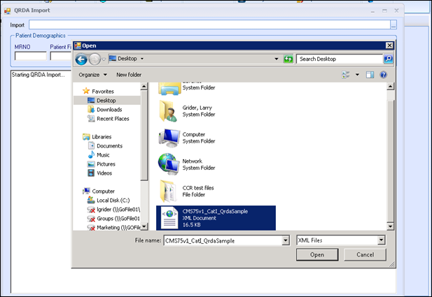 3. Browse out to the location of the QRDA file(s) you wish to import to the Measure and CQM calculation table within the Medical database by clicking on the box to the far right of the import field. Once the file is identified and selected click the Open button to import the file.
