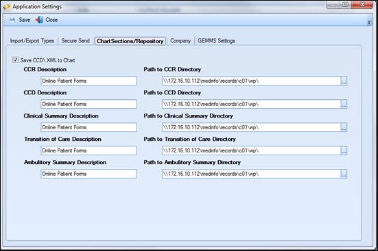 1. Check the” Save to Repository” box if you would like the created CCDA placed in the patients chart. Paths for CCR, CCDA, Clinical Summary, Transition of Care and Ambulatory Summary can be configured individually.