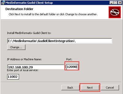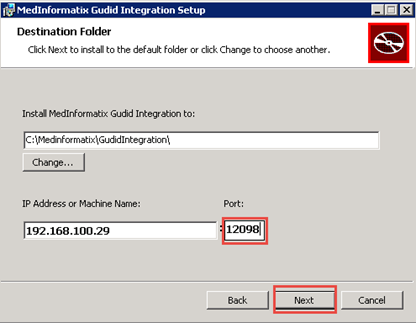 Enter the LAN IP address for the server and any non-conflicting port such as 10020 (in the range of other Medinfo services).