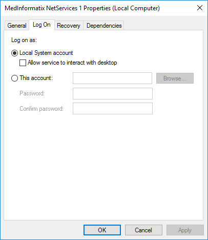 - Local System account: Click checkbox to allow service to interact with desktop.