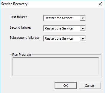 Designate the service recovery options. These options can be different for first failure, second failure and all subsequent failures. Defaults to Restart the Service.
