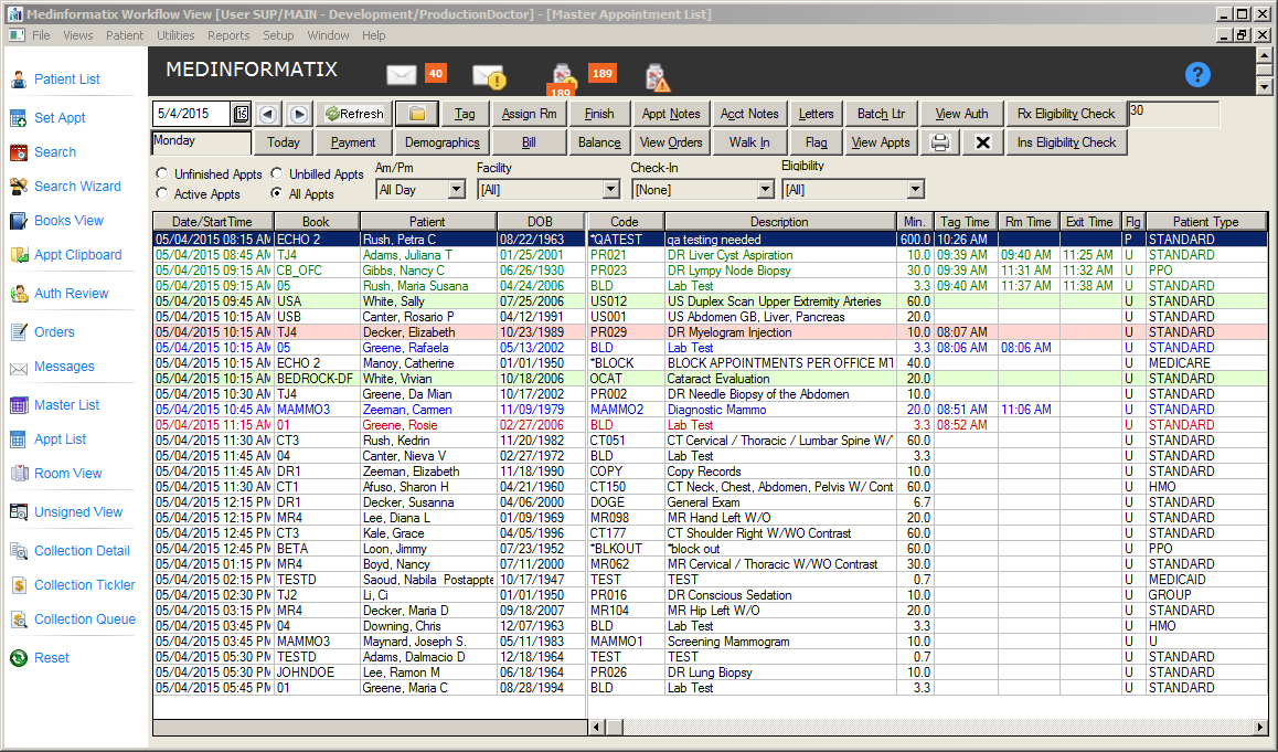 Upon arrival, the front desk staff will typically use four features of the MedInformatix workflow, which can be performed in either the Master List screen or the Appt List screen.