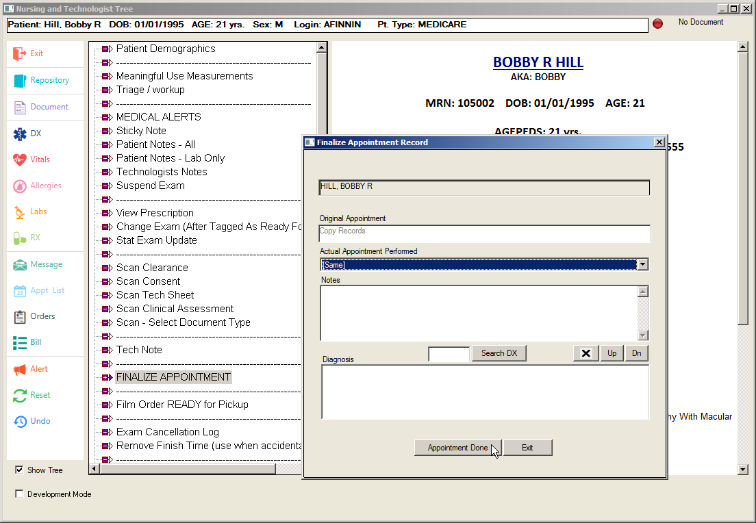 Click the Appointment Done button, which will close the Finalize Appointment Record screen and return users to the Technologist Decision Tree screen