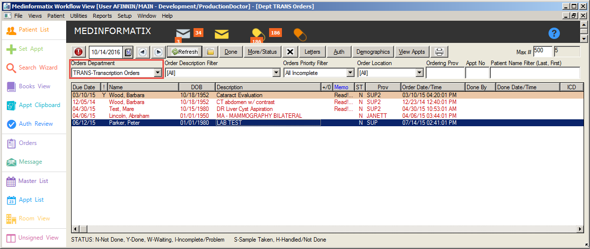 - Select TRANS-Transcription Orders from the Orders Department pulldown list to open the list of transcription orders.