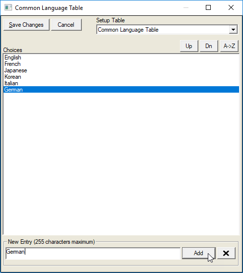 | Common Language table | Selects one of several common languages spoken by patients in a particular practice area. Located in the Language field dropdown on the Demographics screen. |