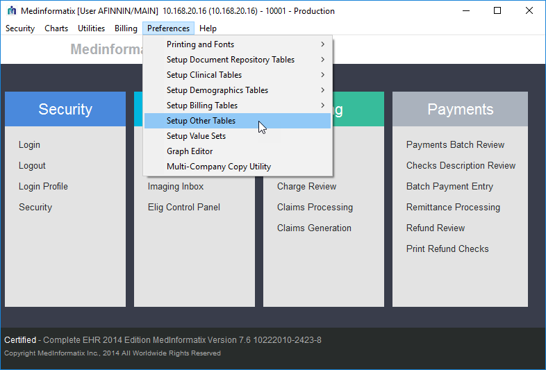 Other value tables have been set up to populate the various screens in Medinformatix. The choices on these screens can be added to or deleted by accessing the tables in the Setup Other Tables feature.