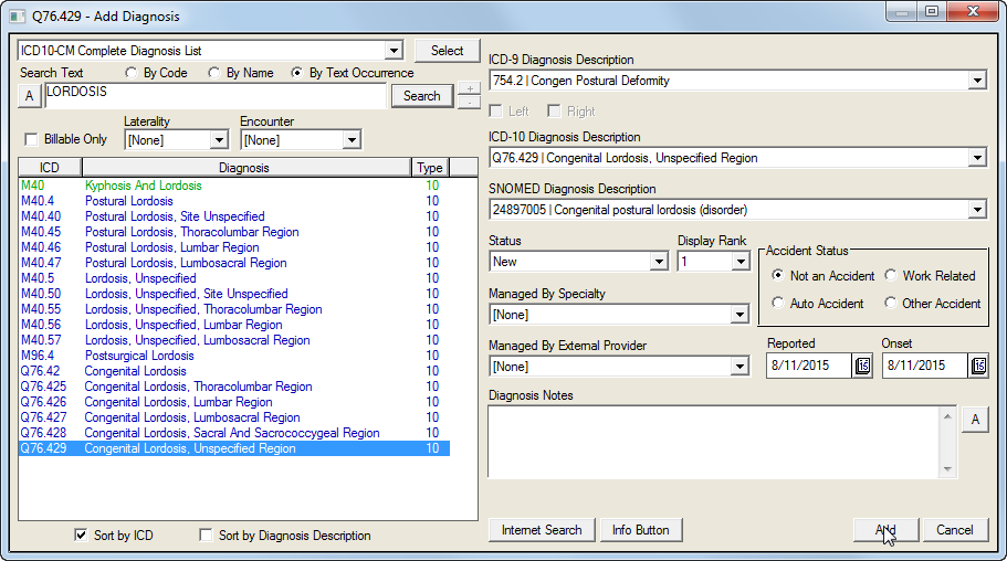 Click the Add button to enter the diagnosis information in the Problem List screen.