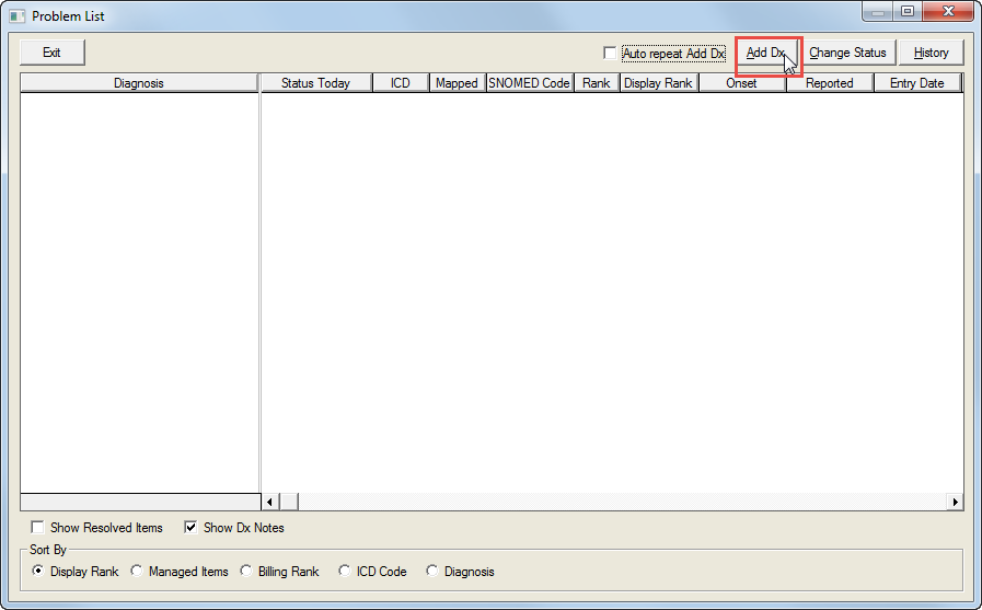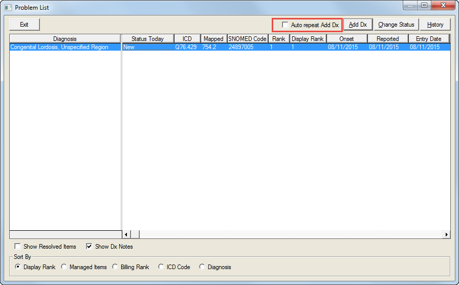 Click the Add Dx button again to add another Diagnosis to the Problem list, or click the Auto repeat Add Dx checkbox to add multiple diagnoses into the Problem List.