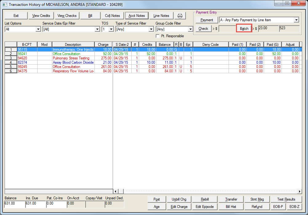 Select the desired patient in the Transaction History screen and then select the Batch button