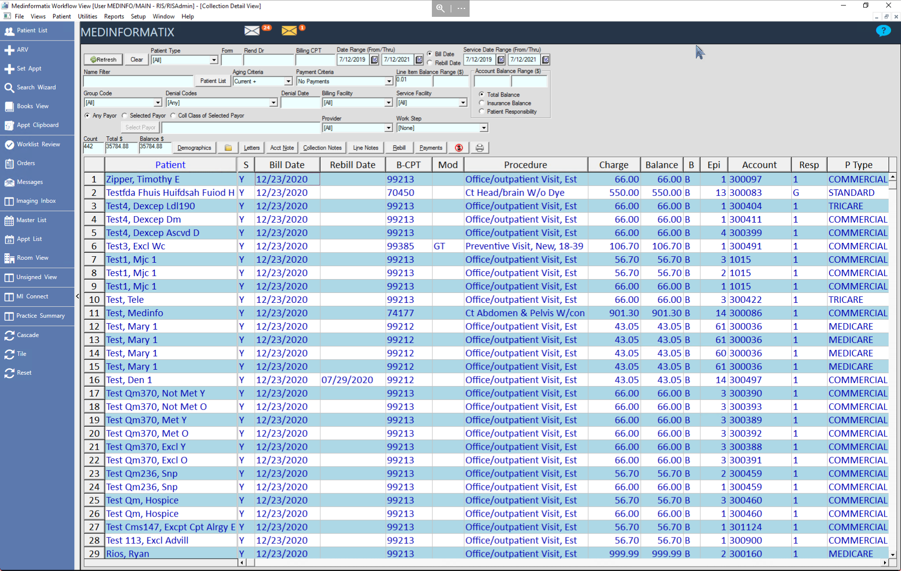 The Collection Detail View screen displays every charge item with a balance for all patients that meet the criteria requested by the collector. The search criteria includes patient type, rendering doctor, aging, cutoff bill date, minimum balance, denial codes, payment criteria, provider, and facility.