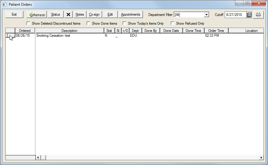 Add notes in the text boxes if desired, click the Order Refused by Patient checkbox if appropriate and select the location from the Location Performed dropdown list.
