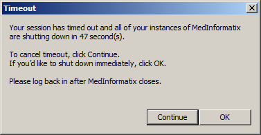 Click the Continue button to cancel the timeout and continue working in Medinformatix OR