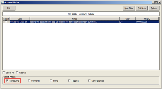 In the Account Notes view, users may select Alert Area(s) indicating if and when the note will pop up and alert the next user who works with this patient. When "Appointments" is selected, the alert pops up during the scheduling process after an appointment is selected but before it is booked. Appointment alerts are also appointment-specific alerts displayed on the clipboard.