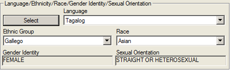 Click the Select button on the Demographics screen to open the Ethnicity, Race, Language, Gender Identity, Sexual Orientation screen.