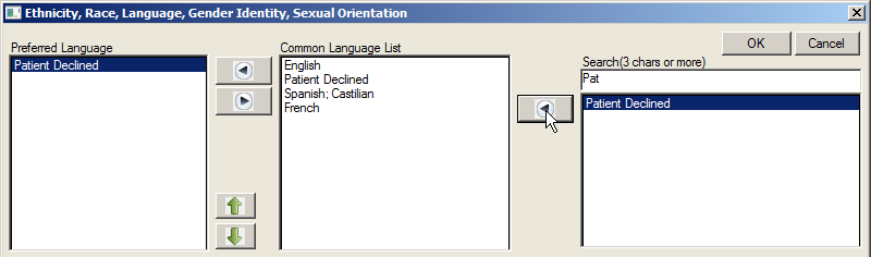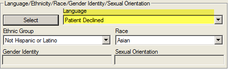 If the patient declines to specify a preferred Language, Ethnicity, Race, Gender Identity or Sexual Orientation, select the Patient Declined choice in the Common Language, Ethnicity or Race list and Gender Identity and Sexual Orientation choice lists.