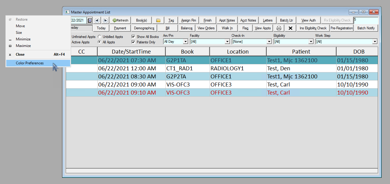 A grid is the multi-row, multi-column component of any screen (i.e. dialog box) that lists information. For instance, in the Master List View, the list of patient appointments is contained in a grid. In the Appointment Review View, the list of appointment requests is contained in a grid. In the Medications History, the list of a patient's medications is contained in a grid. Using the Odd / Even Row Background color settings can help create better differentiation between consecutive rows, as seen in the above screenshot of the Master List.