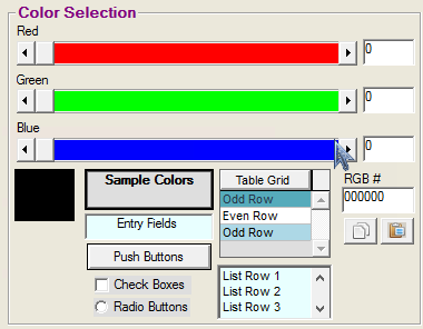 Use the sliders to choose your RGB colors, type the percentage directly in the box to the right of the slider, or easiest, directly in the RGB # field with the color of your liking. RGB color grids & schemes are numerous and readily available on the Internet.