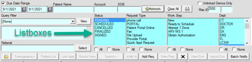 Listboxes are typically used as filters in MedInformatix. For example, in the Enhanced Orders View, there are four side-by-side listboxes used to filters the list of Orders, as seen in this screenshot.